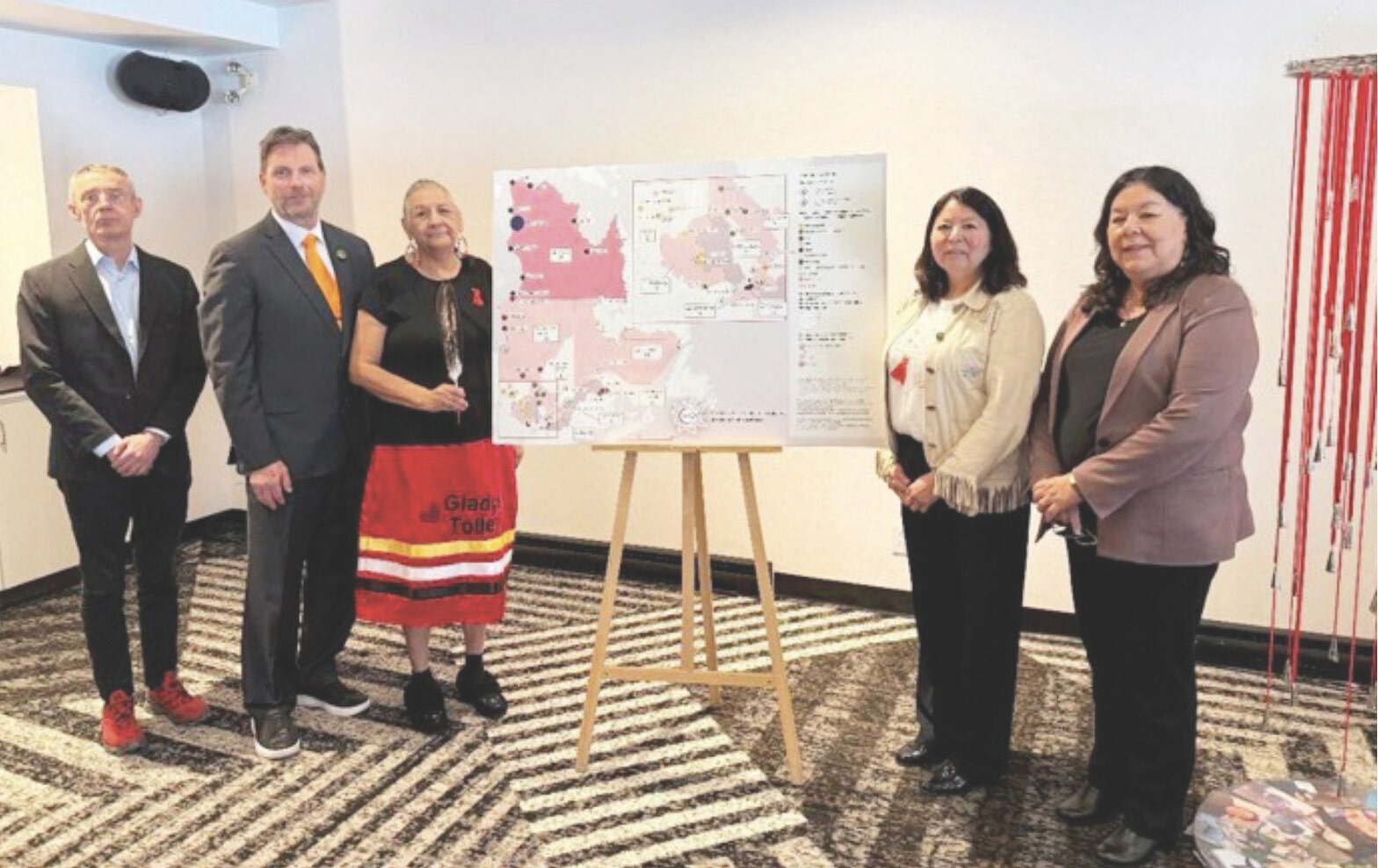 Quebec Native Women president Marjolaine Étienne joined partners and advisors to unveil a provincial map documenting 124 cases of missing and murdered Indigenous women in Quebec, pictured from left: Paul-André Perron, Strategic Advisor to the Coroner's Office; Pierre Simard, Director of the Quebec Association of First Nations and Inuit Police Directors; Bridget Tolley, member of the MMIWG2S+ mapping advisory committee; Étienne; and Laura Rock, Interim Executive Director of Quebec Native Women. Photo: Courtesy of QNW